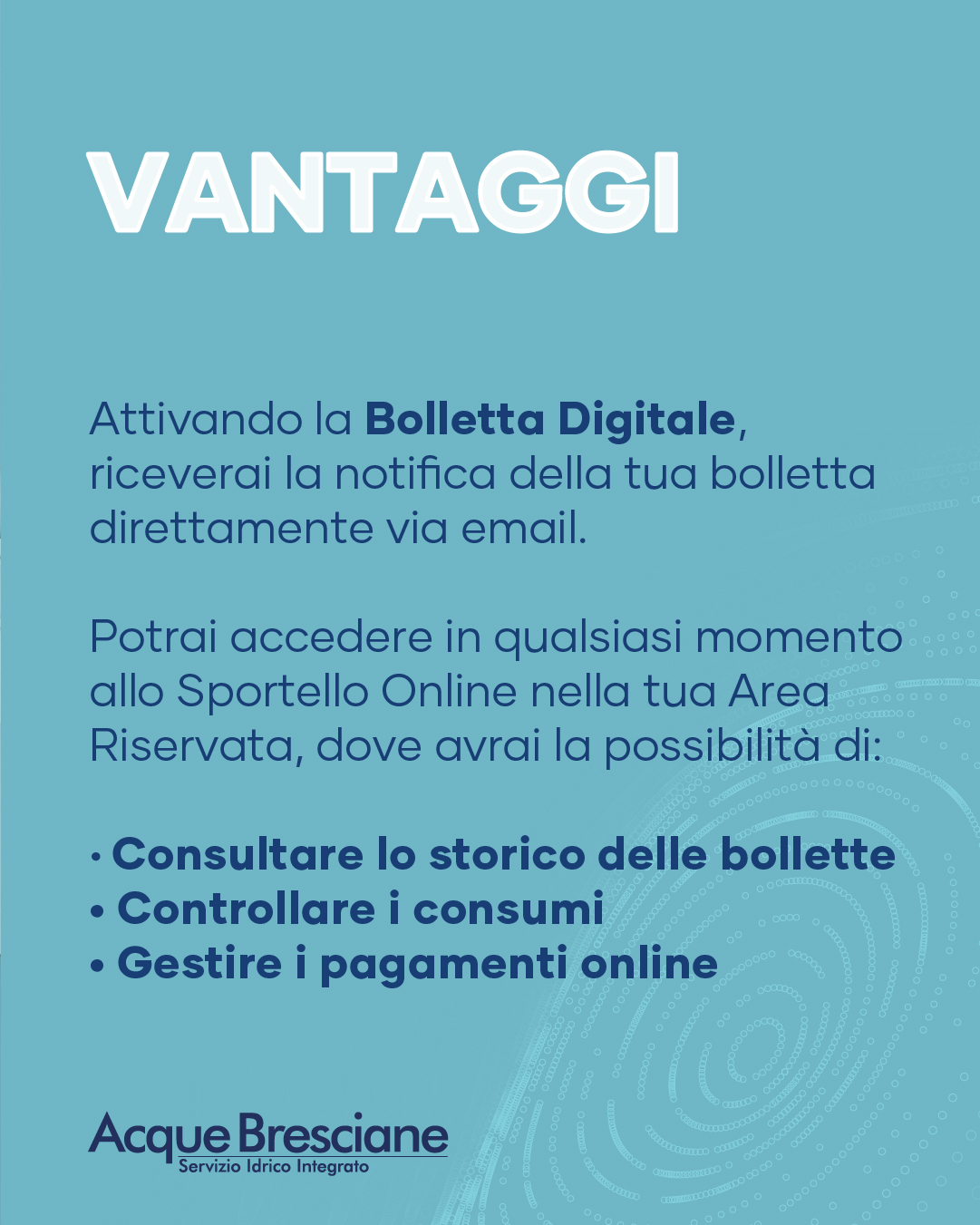 Acque Bresciane avvisa gli utenti circa la possibilità di attivare la bolletta digitale e avere gratuitamente il Fondo perdite occulte che integra e rafforza le tutele minime già previste dalla normativa in caso di perdite nella propria rete interna.